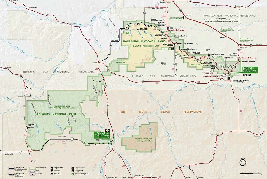 Below is the official Badlands National Park map as a jpeg and in three geocoded formats, as a GeoTIFF, as a KMZ file, and in Oruxmaps format. The official park map as a PDF can be found here.