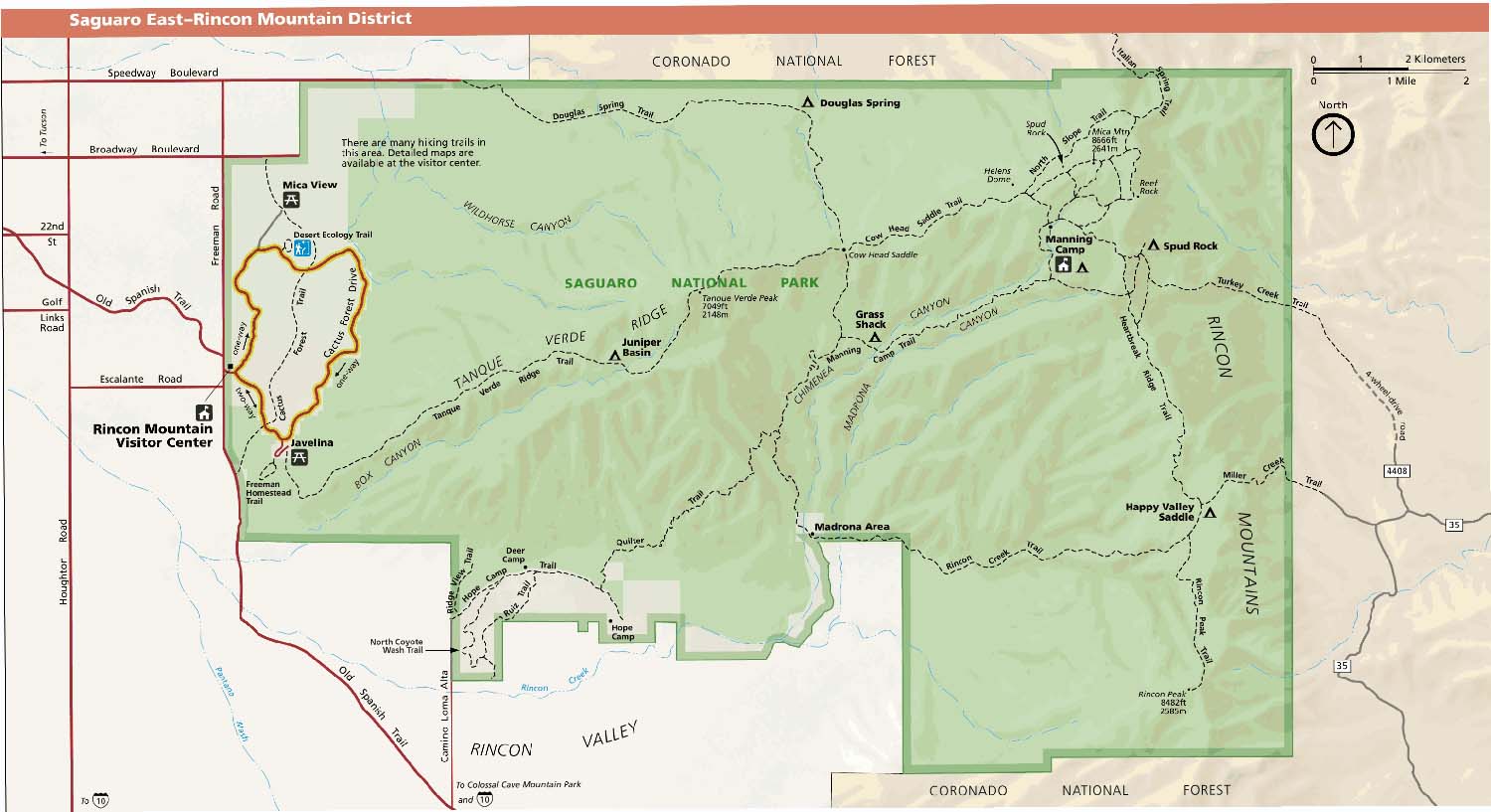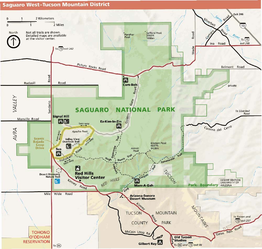 Here is a Google map showing the locations of the above as well as most of the many trails in Saguaro National Park: