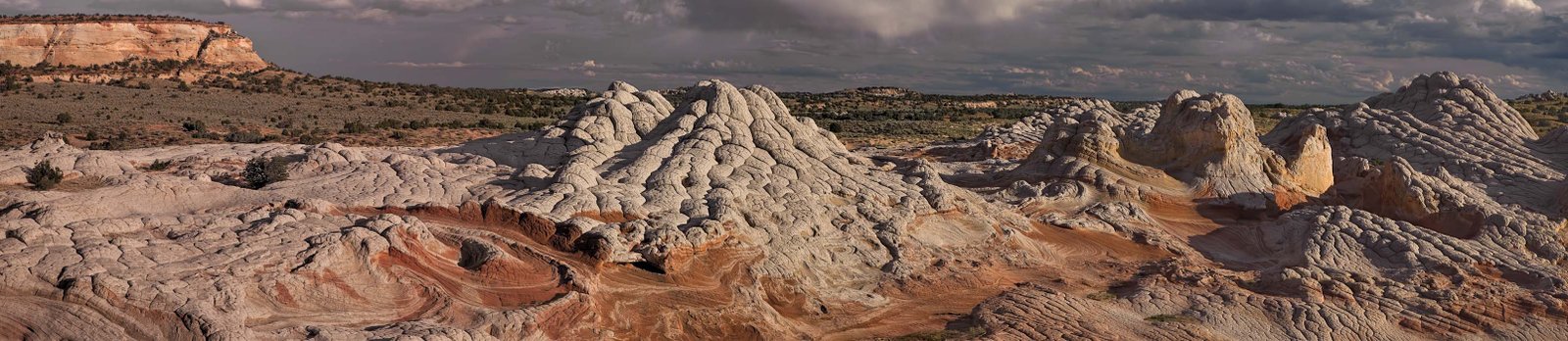 You can capture a reflection of the monolith at sunrise by descending to the western edge of the White Pocket, as the photographer in the center of the image is doing. Note the reflection just before the sage begins.